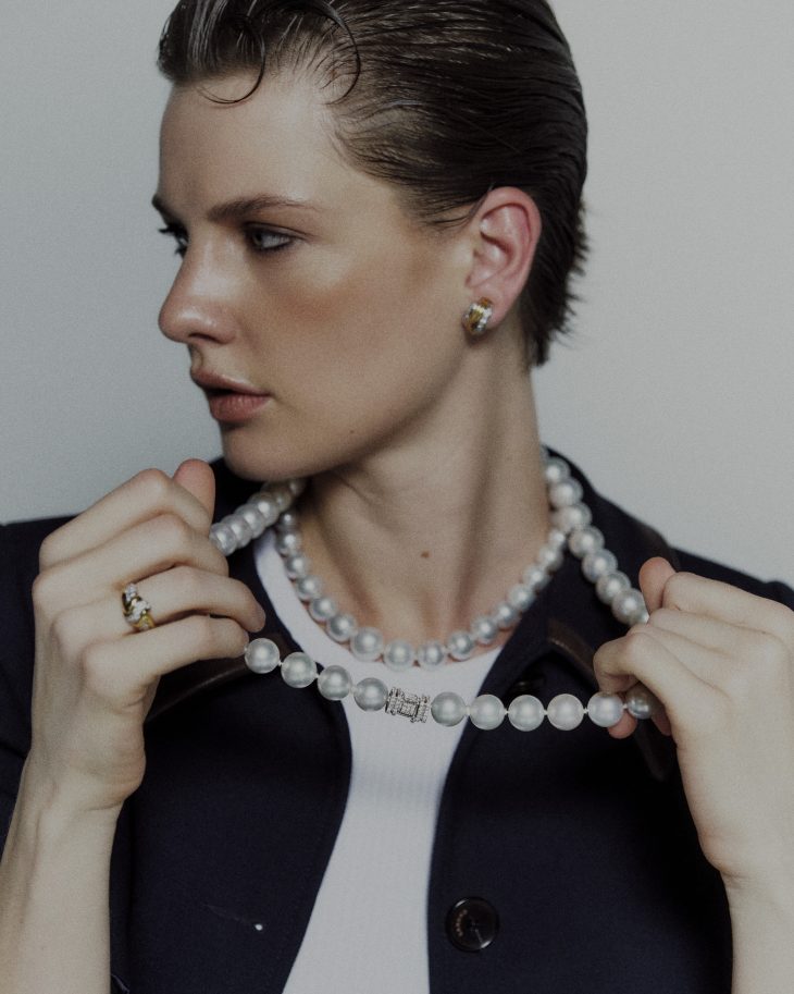 El collar traza una línea continua, casi meditativa. Perlas australianas que avanzan con ritmo propio, interrumpidas apenas por detalles que rompen la simetría con intención. Hay pausa, respiración y cadencia.