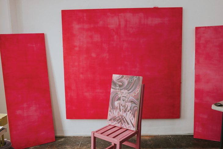 IM: Siempre he tenido una paleta de colores muy marcada. Por ejemplo, al inicio, el rosa fosforescente apareció en mi obra a partir del uso de materiales como el plástico impermeable. También influyeron mi interés en el glitch y los textiles de Oaxaca, donde predominan tonos como el verde y el amarillo. El rosa es un color que te invita a explorarlo en todas sus tonalidades. El claroscuro rosa es infinito: me interesa hacer variaciones, generar volúmenes y sombras a partir de él. También pienso en mi etapa happy punk: pink is punk.