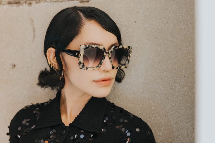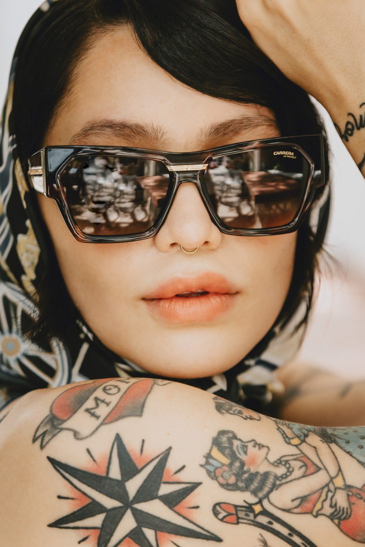 lentes Carrera mascada y vestido Hermès
