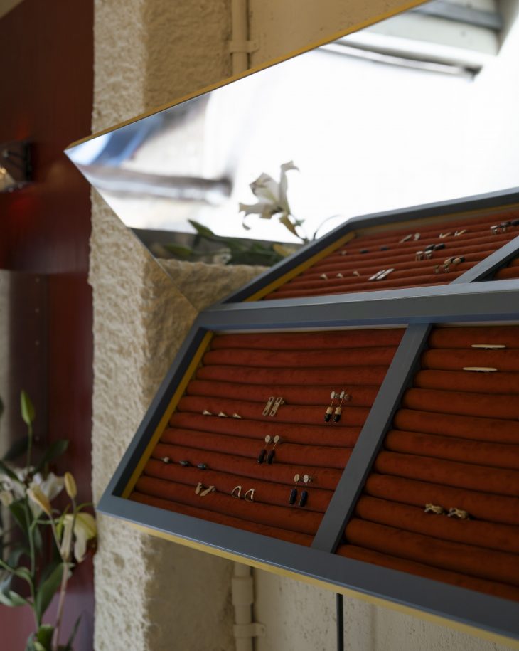 Los muebles que custodian las joyas están pensados con trazo milimétrico y armónico. Estas vitrinas y lámparas son obra de Laissa Mercês, y se integran con el resto del interiorismo para hacernos sentir que la estrechez del espacio no incomoda, sino que se vuelve un rotundo statement que refuerza la personalidad de la tienda.